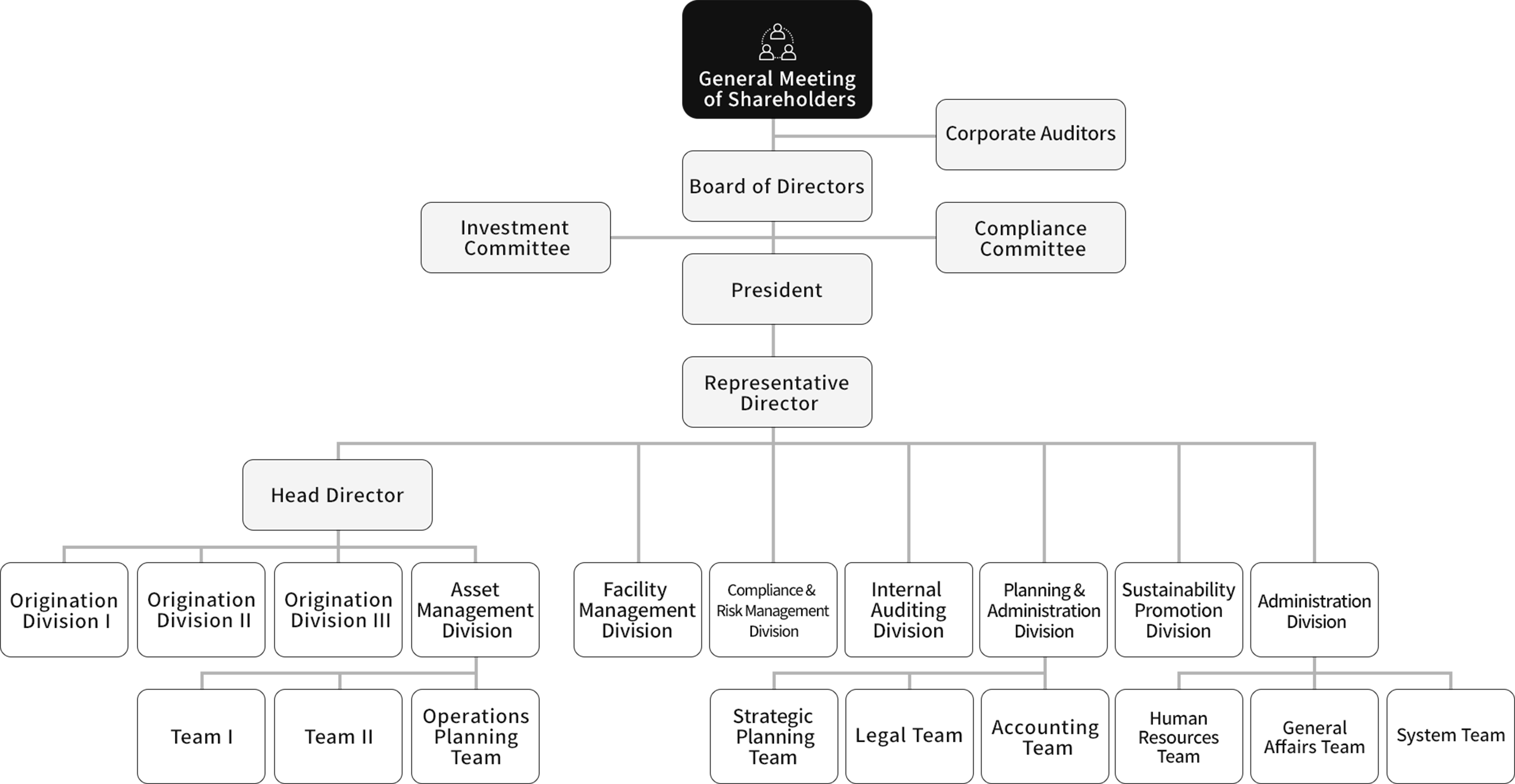 As a member of the Mizuho Financial Group, which aspires to be a comprehensive financial consulting group, we will keep working to ensure that we can continue to realize sustainable and stable contribution to the economy and society through the real estate investment market as a real estate asset management company that enhances the value of and creates new added value for the assets entrusted to us by continuing to be an “organization” boasting high technical capabilities and strategic planning and execution capabilities formed by the combined “individual” strengths of each and every person at the Company while utilizing the financial functions of the Group.